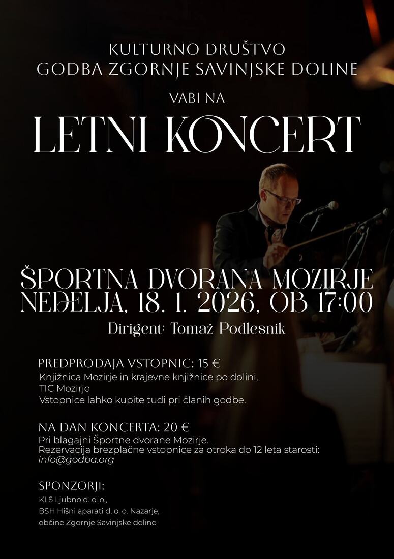 Predprodaja: 15 € (Knjižnica Mozirje, krajevne knjižnice po občini, TIC Mozirje, člani godbe)