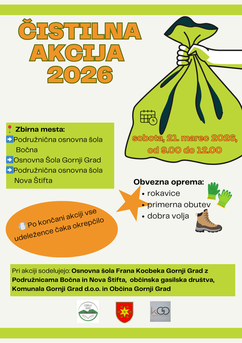 Občina Gornji Grad v sodelovanju z Osnovno šolo Frana Kocbeka Gornji Grad, podružničnima šolama Bočna in Nova Štifta, občinskimi gasilskimi društvi ter Komunalo Gornji Grad vabi vse občanke in občane na spomladansko čistilno akcijo 2026, ki bo letos potekala istočasno v vseh občinah Zgornje Savinjske doline.