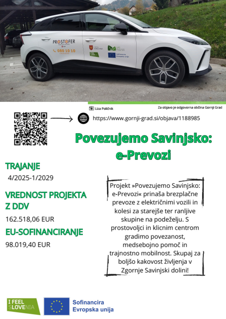 Omenjene občine bodo kupile oziroma pridobile dva električna avtomobila, dve občini bosta najeli avtomobila za nudenje brezplačnih prevozov po vzoru »Prostofer«, ki ga izvajajo že v mnogih slovenskih krajih. S tem bodo socialno ogroženim občanom, ki nimajo lastnega prevoza in niti svojcev, ki bi jim to omogočili, nudile brezplačne prevoze do urbanih centrov, kjer bodo koristili različne storitve. Številni starejši občani imajo velike težave s prevozi, saj na območjih s razpršeno poselitvijo ni javnih avtobusnih povezav, ki bi jim omogočile dostop do urbanih središč. S tem izgubljajo tudi urbani centri na območju LAS, saj je dostop okoliškim prebivalcem onemogočen oziroma so le ti odvisni od pomoči družinskih članov. Vzpostavljen bo sistem, ki bo uporabnikom omogočal brezplačen prevoz na podlagi klica v komunikacijski center, ki bo prevoze razporejal. Vozniki bodo prostovoljci, domačini, ki dobro poznajo potrebe občanov in samo območje, ki je zelo razgibano in prepredeno z več sto km lokalnih in regionalnih cest. S tem projektom bo omogočena večja mobilnost, boljša socialna vključenost, medsebojno povezovanje, medsebojna pomoč in posledično zagotovljena večja kvaliteta življenja v domačem okolju.