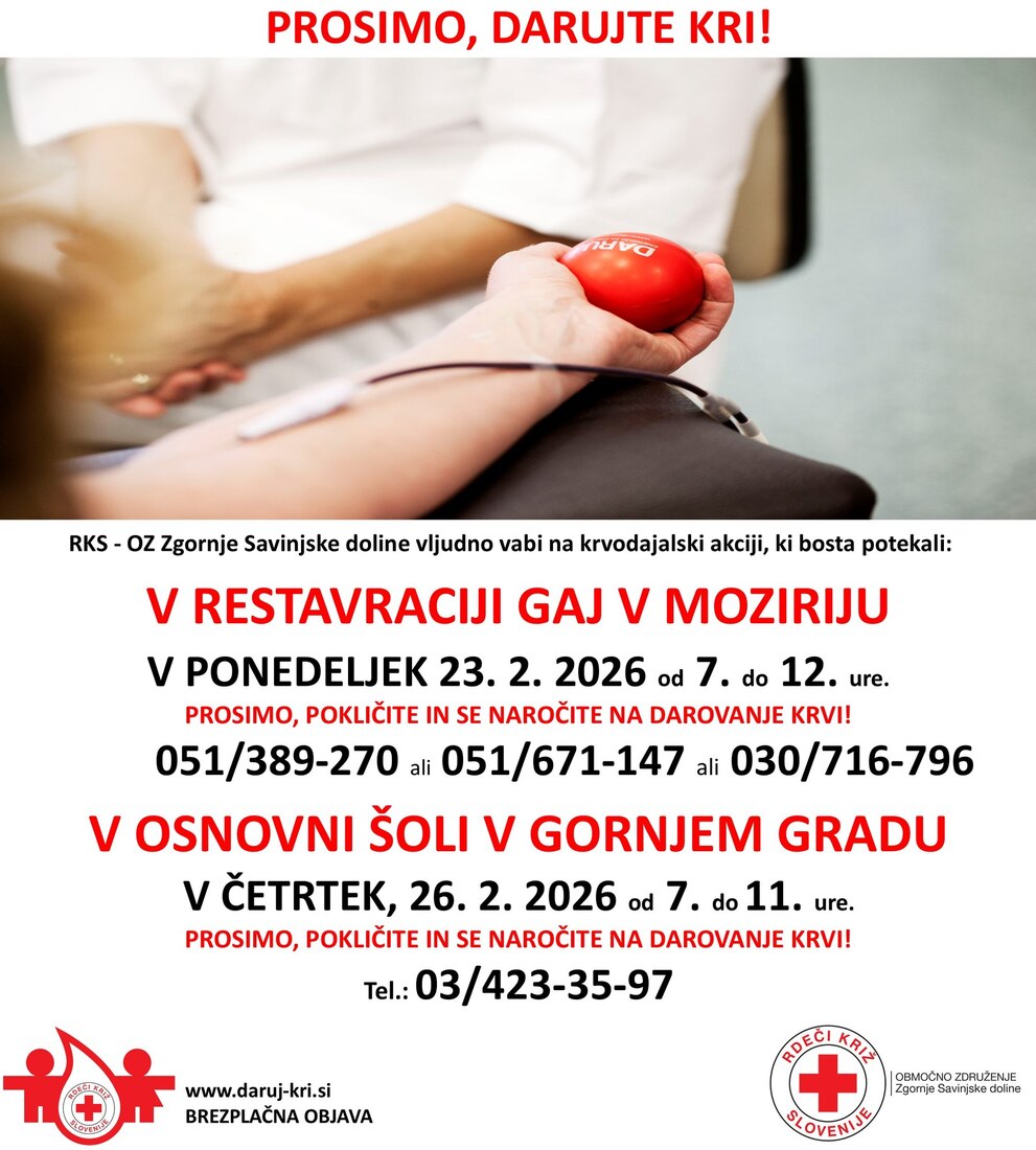 Rdeči križ Slovenije – Območno združenje Zgornje Savinjske doline vabi na krvodajalsko akcijo, ki bo potekala v prostorih Osnovne šole Gornji Grad.
