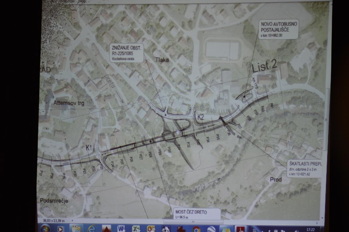 Projektant Domagoj Bačič pa se je posvetil podrobnostim gradnje obvoznice. Projekt se bo začel pri nekdanji Smreki in zaključil pri Osnovni šoli, dolžina ceste bo dober kilometer, zgrajen pa bo tudi most čez reko Dreto. Bačič je na načrtih prikazal tudi, kje bosta novi križišči, po kateri strani bo zgrajen pločnik, kje bodo prehodi za pešce in podobno. Omenil je tudi višino mostu, kje bodo zadrževalniki za vodo in kako bo urejena brežina, saj projekt poteka na poplavnem področju.