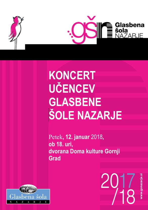 Glasbena šola Nazarje vabi na koncert učencev Glasbene šole Nazarje, ki bo 12. januarja 2018, ob 18.00 uri, v dvorani Kulturnega doma Gornji Grad. Vljudni vabljeni!
