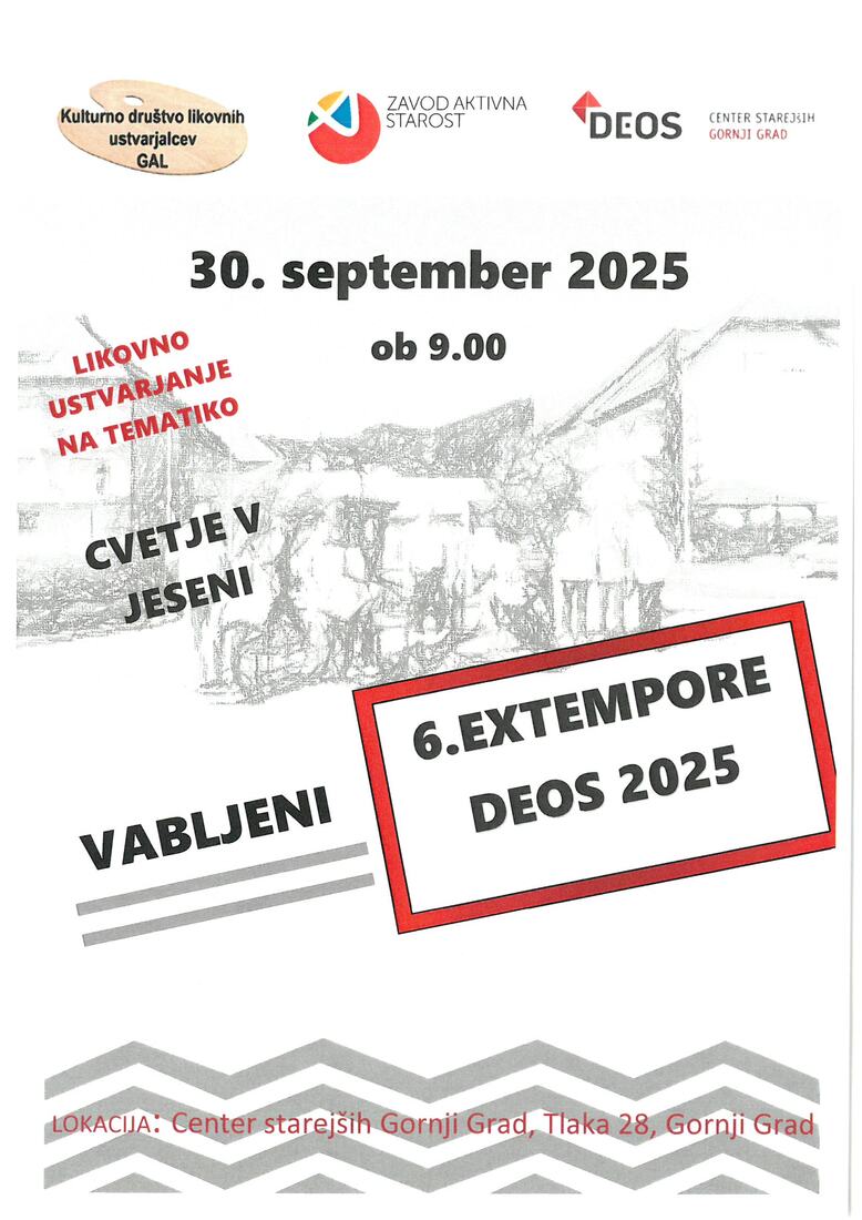 Zavod aktivna starost in Občina Gornji Grad v sodelovanju z DEOS Center starejših Gornji Grad in KDLU GAL Rečica ob Savinji vabimo slikarje, kiparje in druge ustvarjalce v likovni umetnosti na 6. Ex-tempore Deos 2025, na temo "CVETJE V JESENI", KI BO 30. septembra 2025 v DEOS Centru Gornji Grad.